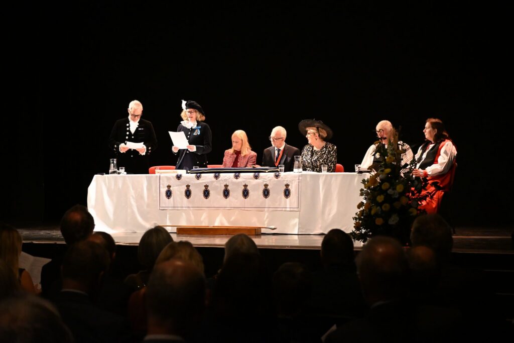 The declaration ceremony in Coastland College’s Bay Theatre, with Dr Helena Conibear accepting office as the High Sheriff of Dorset, with outgoing High Sheriff Callum Bremner pictured far left